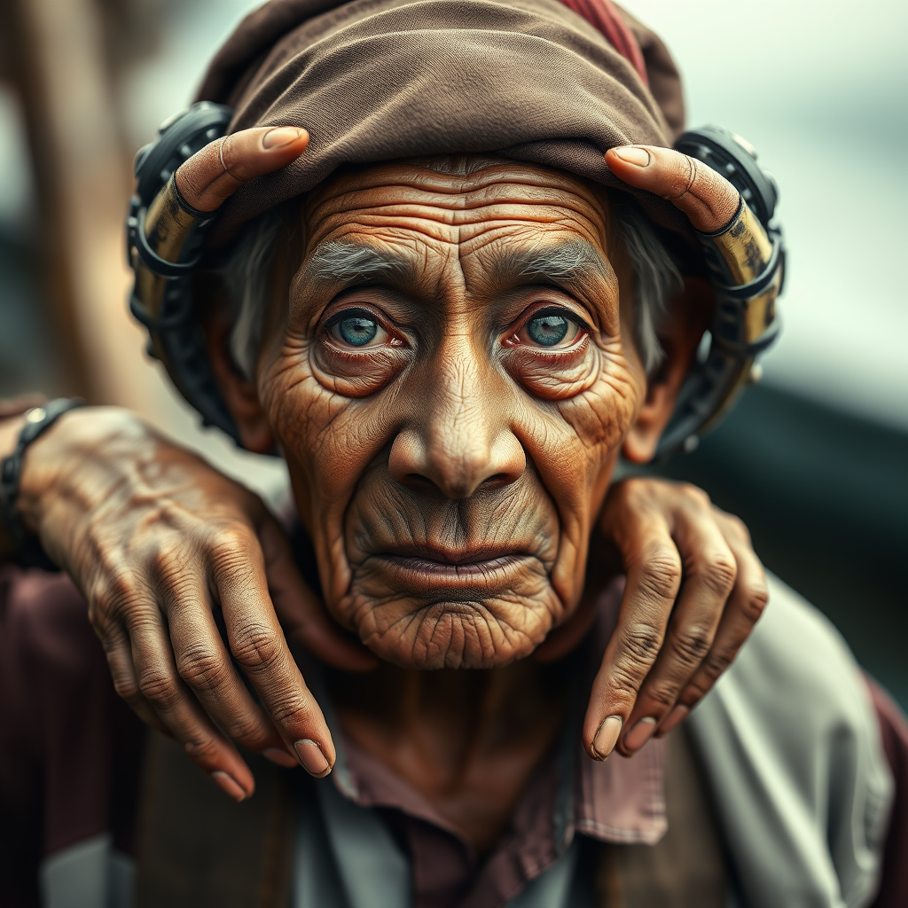 Professional medium-shot portrait of an elderly fisherman, age 50, captured with a shallow depth of field using a 100mm lens on a Nikon Z9. The composition features unconventional elements like robotic eyes and unusual anatomy, including extra limbs and fingers. The hands and feet are oddly drawn, creating a surreal and disfigured appearance. The image is characterized by an out-of-frame composition, with a sense of tiling and mutation, resulting in a 3D, blurry, and distorted visual effect. The colors are muted and desaturated, enhancing the unique, otherworldly vibe of the portrait.
