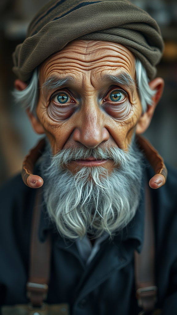 Professional medium-shot portrait of an elderly fisherman, aged 50, captured with a deep focus using f/1.8 aperture and 100mm lens, on a Nikon Z9. The fisherman has unique mechanical eyes and an intriguing, unconventional anatomy. There are surreal and artistic elements like extra limbs and fingers, giving an impression of a dream-like quality. Some features are intentionally out of focus or slightly blurred, creating a sense of movement and distortion. The portrait combines traditional elements with a futuristic twist, showcasing an abstract, slightly mutated impression. The colors are subtly desaturated for a timeless, artistic look.