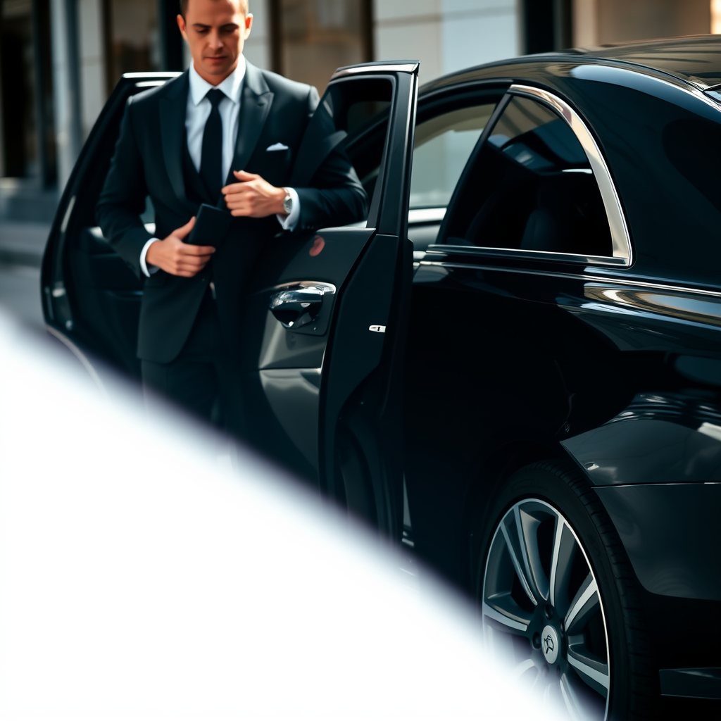 Professional photo capturing the essence of a luxury car VIP transfer service, featuring a poised chauffeur in a sleek black suit attending to the needs of corporate clientele, a glossy black car adding to the opulence, focus on the intricate details of a slightly open back door, captured with a classic Leica 50mm lens at f1.4, creating a sense of exclusivity and sophistication, subtly enhanced with a play of light and shadow to accentuate the elegant ambiance.