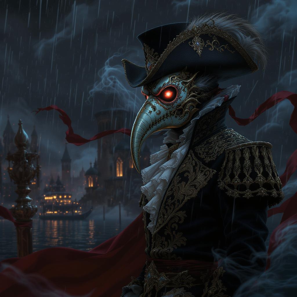 Professional photo of a figure in a plague doctor outfit, featuring ornate and high-detail Venetian elements. The image is rendered in 8k UHD with HDR, combining anime and manga styles. It showcases digital art enriched with glow effects, hand-drawn aesthetics, and advanced rendering techniques from cinema 4D and Blender. The scene is dark and atmospheric, ultra-detailed with a cinematic and sensual feel, ensuring sharp focus and hyperrealism. Vivid colors and a deep depth of field add to the masterpiece quality, reminiscent of a professional majestic oil painting by artists like Ed Blinkey, Atey Ghailan, and inspirations from Studio Ghibli, Jeremy Mann, Greg Manchess, and Antonio Moro. The artwork is designed to be intricate, high-detail, and dramatic, trending on platforms like ArtStation and CGSociety. It maintains a sharp focus with dramatic flair, blending photorealistic painting art styles by Midjourney and Greg Rutkowski, ensuring the visual retains its integrity and avoids common pitfalls like poor anatomy or blurred elements.