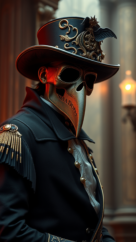 Professional photo in a plague doctor outfit, ornate high detail, Venetian style, 8k resolution, UHD, HDR, anime and manga style digital art with glow effects, hand-drawn with octane render, cinema 4d and blender elements, dark atmospheric feel, ultra detailed and cinematic, sensual and sharp focus, hyperrealistic with big depth of field, masterpiece quality, vivid colors and model shoot style, professional majestic oil painting inspired by Ed Blinkey, Atey Ghailan, Studio Ghibli, Jeremy Mann, Greg Manchess, Antonio Moro, trending on ArtStation and CGSociety, intricate and high detail, dramatic and photorealistic painting art, concept art with sharp focus, rendered by prominent art influences, maintaining clarity and coherence throughout.