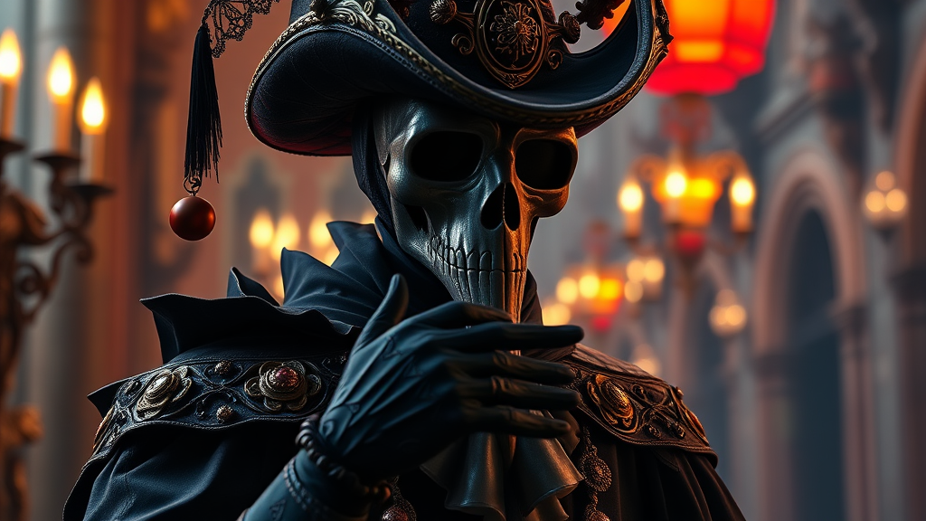 Professional photo of a figure in a plague doctor outfit, ornate and highly detailed, with a Venetian influence. The image is in 8k UHD, HDR, rendered in an anime and manga style that merges digital art with glow effects. It features hand-drawn aesthetics enhanced by octane render using cinema 4d and blender, creating a dark, atmospheric scene with ultra-detailed 4k resolution. The presentation is cinematic and sensual with sharp focus and hyper-realistic depth of field. The masterpiece painting combines vivid colors and a 3d octane render, designed as concept art trending on ArtStation. The style captures the elegance of a model shoot, crafted like a professional oil painting by artists such as Ed Blinkey, Atey Ghailan, and influenced by Studio Ghibli, Jeremy Mann, Greg Manchess, and Antonio Moro. This piece is intricate, highly detailed, with sharp focus and a dramatic, photorealistic quality as seen in works by midjourney and Greg Rutkowski. The painting stands out with its majestic blend of art styles, vividness, and depth.