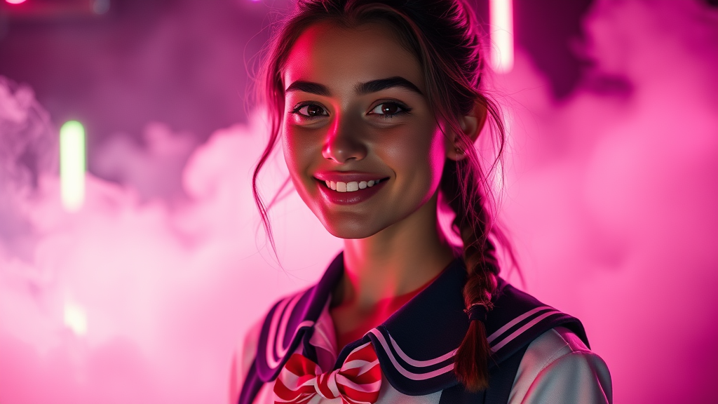 Professional photograph capturing anyataylorjoy1-2500 with a radiant smile, dressed in a chic preppy school girl uniform, showcasing her flawless olive complexion and striking features. The scene is set against a mesmerizing backdrop of neon light-infused smoke, enveloped in volumetric fog. The composition emphasizes hyperrealism with indirect lighting, highlighting intricate details that render the image breathtaking in its clarity and depth, all in stunning 8k UHD resolution.