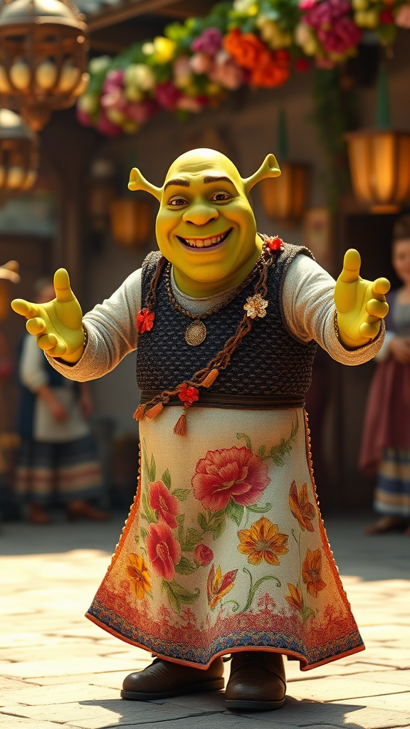Professional photograph of Shrek adorned in richly decorated floral ornaments and a long folk dress, exuding fun and joy as he dances. The scene is highly detailed, with photo-realistic precision, capturing intricate textures under ambient sunlight. The image is rendered in 8k UHD, showcasing vibrant colors and sharpness. Despite its vivid beauty, subtle imperfections like text errors, slight cropping, and minimal artifacts add an authentic touch. Shrek's expressive face, accurately drawn hands, and natural proportions create a captivating and whimsical atmosphere, free of any distortions or anomalies like extra limbs or mutated features. The composition is perfectly framed, emphasizing Shrek's joyful character and playful essence without distractions like watermarks or signatures.