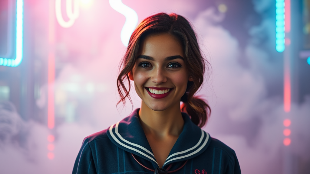 Professional photography capturing Anya Taylor-Joy with a radiant smile, dressed in a chic preppy schoolgirl uniform, her olive skin and flawless features beautifully highlighted. The background is a mesmerizing blend of neon light and swirling smoke, enveloped in volumetric fog, creating an atmospheric setting. The scene is hyperrealistic, with indirect lighting enhancing the intricate details. The overall image is breathtakingly vivid, presented in stunning 8k UHD quality.