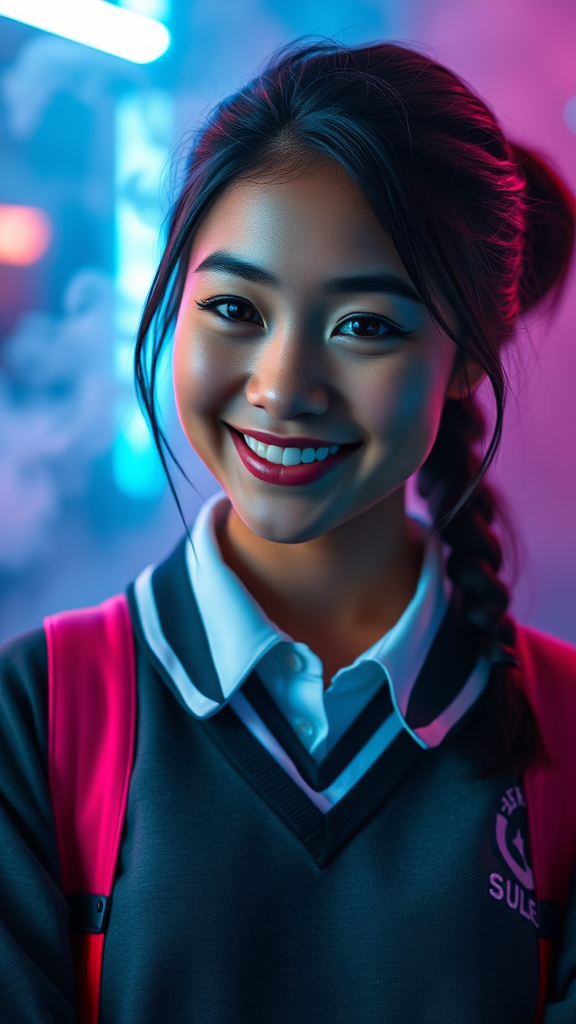 Professional photography of a young woman with striking features, smiling radiantly, dressed in a preppy school uniform. She has an olive complexion and an impeccably symmetrical face, set against a vibrant background of neon light smoke. The scene is enveloped in volumetric fog, creating an atmosphere of mystery. The image is crafted in hyperrealism, with indirect lighting illuminating every detail, resulting in a breathtaking visual experience captured in 8k UHD resolution.