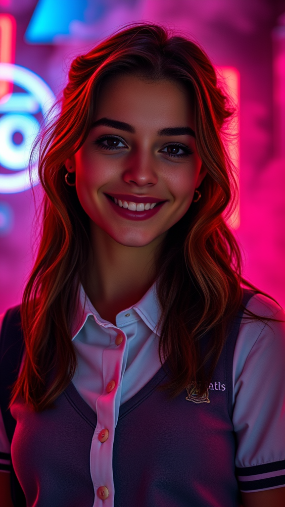 Professional photography of an elegant young woman with a striking resemblance to Anya Taylor-Joy, smiling warmly, dressed in an upscale, preppy school uniform, her flawless olive skin glowing under soft, ambient lighting. The background features swirling neon light and ethereal smoke, accentuated by volumetric fog. The scene is captured in hyperrealism with indirect lighting, showcasing highly detailed features. The overall composition is breathtaking and stunning, rendered in 8K UHD resolution.