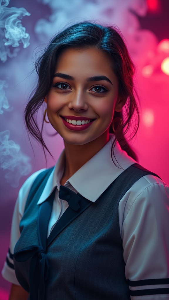 Professional portrait capturing Anya Taylor-Joy with a radiant smile, dressed in an elegant preppy schoolgirl uniform, showcasing her flawless features and olive skin tone amidst a mesmerizing backdrop of neon-lit smoke. The atmosphere is enriched by soft volumetric fog and subtle indirect lighting, enhancing the hyperrealistic quality. The image is intricately detailed, breathtaking, and presented in stunning 8k ultra-high definition, offering a contemporary twist with a hint of ethereal charm.