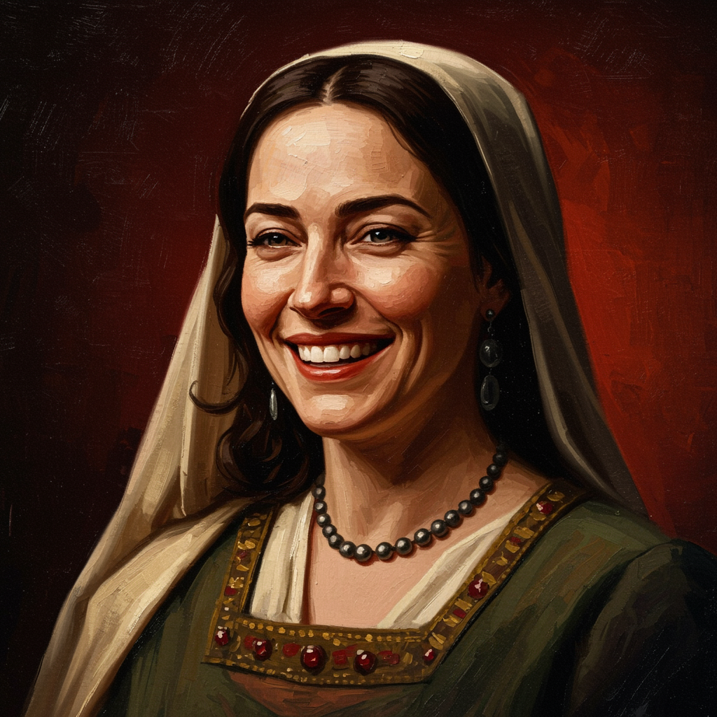 Professional portrait of a 12th-century woman with a joyful expression, showcasing the essence of the XII century. The artwork employs heavy brushstrokes and textured, impasto paint to create a highly detailed and intricate composition. Cinematic lighting adds depth, highlighting the dramatic yet vibrant atmosphere. Her skin is richly textured and lifelike, reminiscent of oil paintings by masters like Vittorio Matteo Corcos, Albert Lynch, and Tom Roberts. The piece exhibits an 8k resolution quality and is trending on art platforms for its exceptional artistry, with subtle nods to medieval attire and accessories for a touch of historical authenticity.