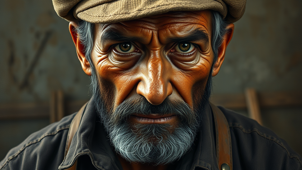 Professional portrait of a 19th-century laborer, a weary expression etched onto his face, embodying the essence of the 1800s. The painting features bold, heavy brushstrokes and rich, textured impasto, capturing the intricate details and highly textured skin of the subject. The lighting is cinematic and dramatic, enhancing the depth and mood of the scene. Rendered in 8k resolution, the artwork combines the stylistic influences of Vittorio Matteo Corcos, Albert Lynch, and Tom Roberts, with subtle creative interpretations. This evocative piece is trending on ArtStation, inviting viewers into a world of historical toil and perseverance.