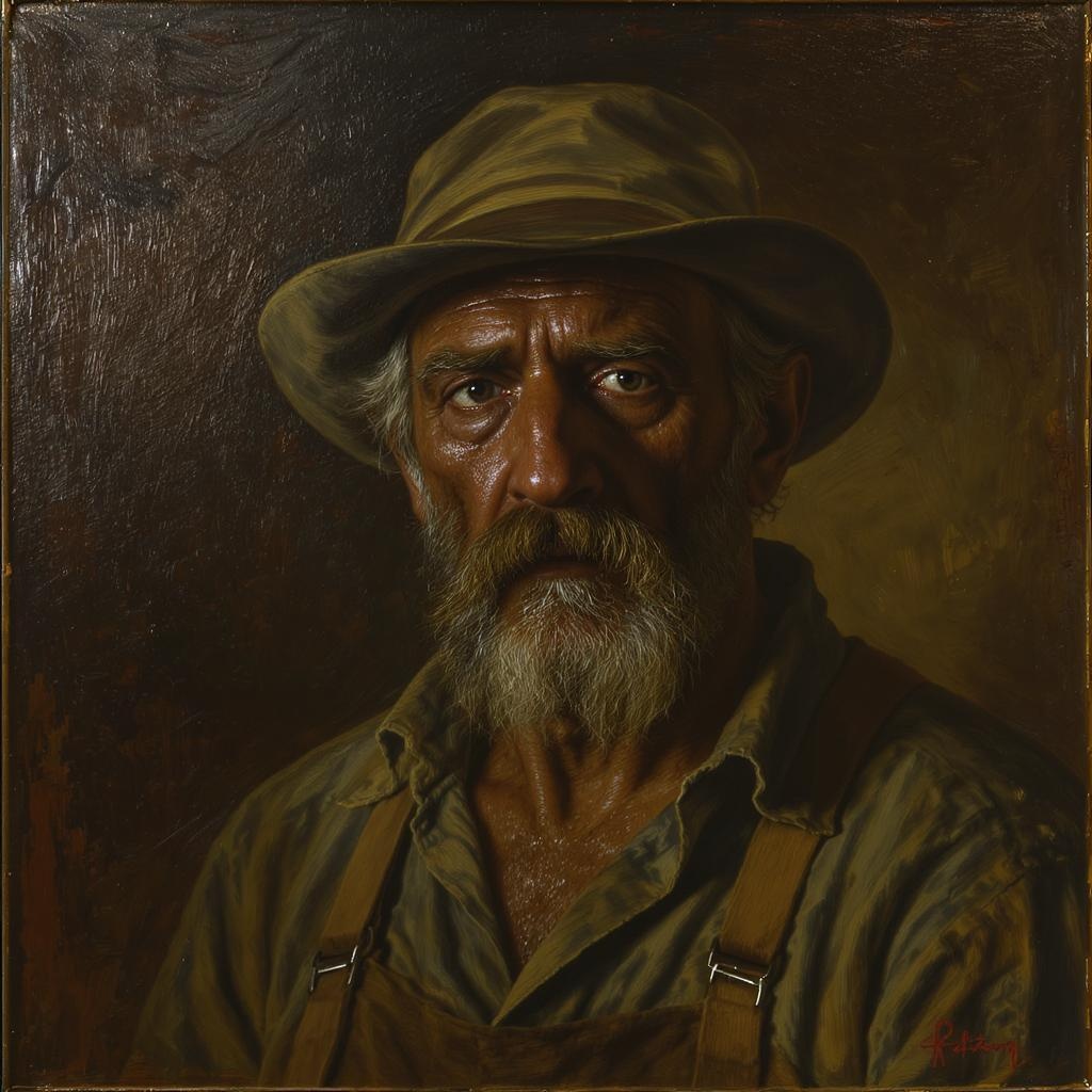 Professional portrait of a 19th-century laborer, a weary male with a fatigued expression, embodying the spirit of the era with the distinctive style of the late 1800s. The painting features vigorous brushstrokes and a rich, textured surface created with impasto techniques. Highly detailed and intricate, it captures dramatic, cinematic lighting with meticulous attention to the weathered, highly textured skin of the subject. Created in the style of an oil painting, it resonates with the dramatic flair of artists such as Vittorio Matteo Corcos, Albert Lynch, and Tom Roberts. Presented in exquisite detail, reminiscent of 8k resolution, and envisioning a modern aesthetic as if trending on platforms like ArtStation, this portrayal feels deeply cinematic and richly narrative, placing the viewer in the 19th-century scene with a subtle yet vivid ambiance.