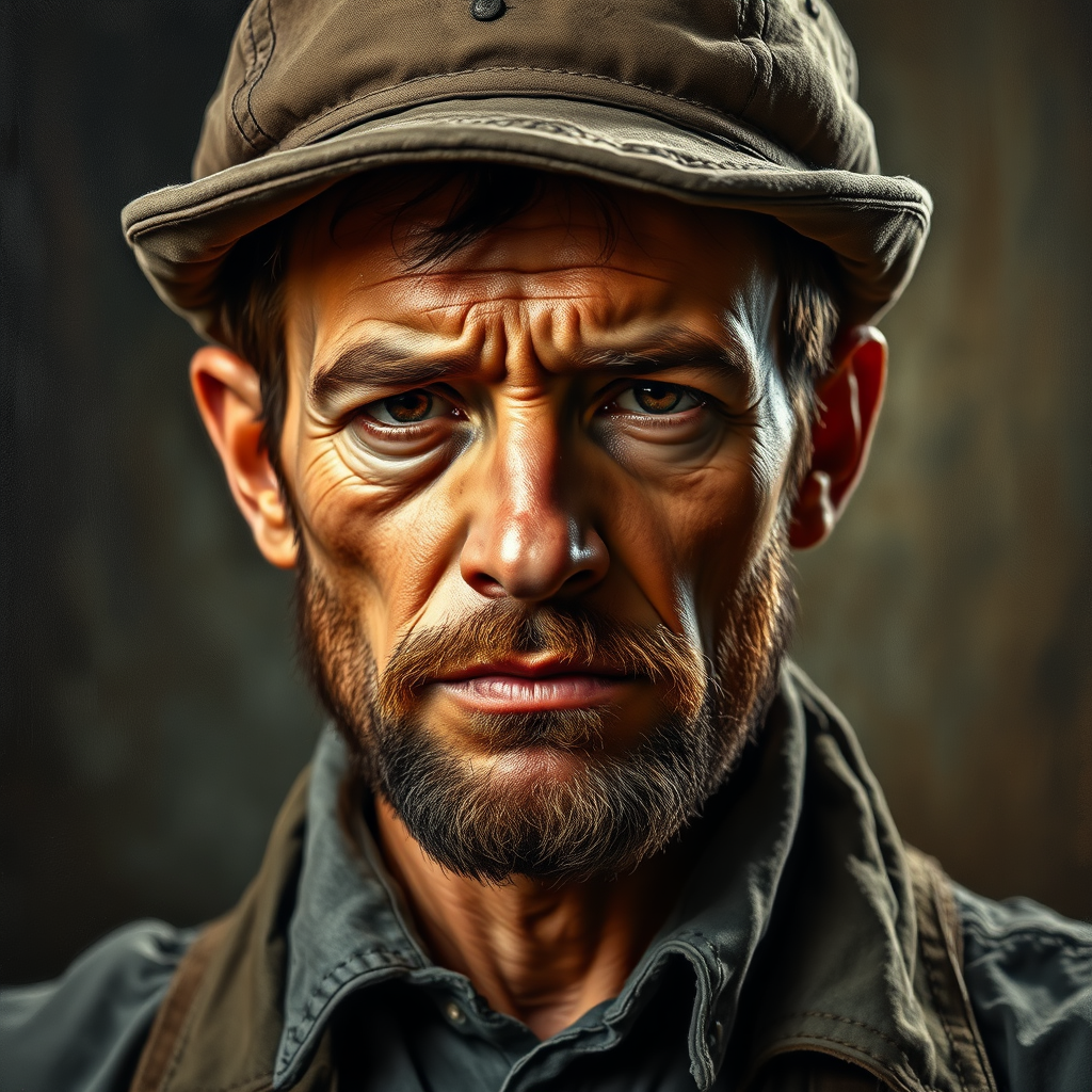 Professional portrait of a 19th-century laborer, masculine figure, weary expression, 1800s attire, robust brushwork, layered pigment, impasto technique, exquisitely detailed, complex composition, theatrical lighting, oil painting, richly textured complexion, intense mood, ultra high-definition, gaining popularity on art platforms, evocative of works by Vittorio Matteo Corcos, Albert Lynch, and Tom Roberts, infused with a subtle modern twist.