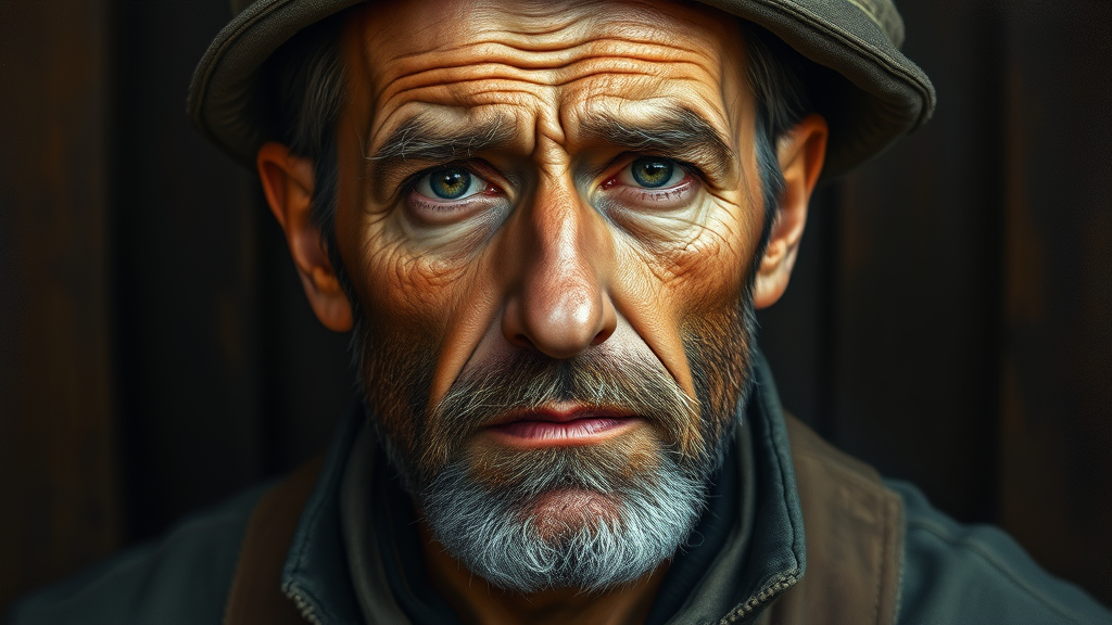 Professional portrait of a 19th-century male worker with a weary expression, featuring heavy brushstrokes and textured oil paint, impasto technique highlighting intricate details and highly textured skin. The scene is illuminated with cinematic lighting, creating a dramatic atmosphere. Inspired by the styles of Vittorio Matteo Corcos, Albert Lynch, and Tom Roberts, capturing the essence of the era in an 8k resolution artwork trending on ArtStation, with subtle modern twists to evoke a timeless yet contemporary appeal.