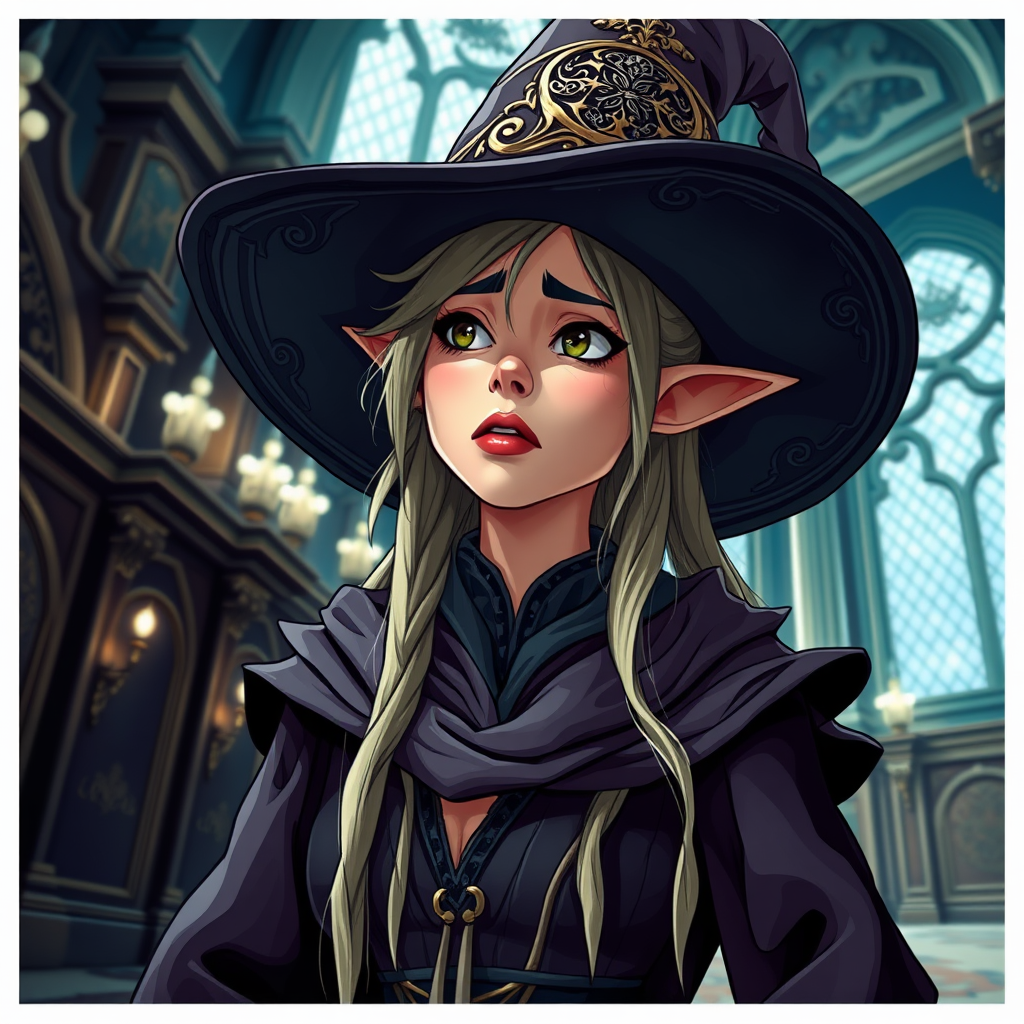 Professional Portrait of a female elf wizard in a majestic palace, featuring a close-up with a disappointed expression, wearing a large ornate hat and long, tattered robes. She exudes a seductive aura with a hint of mystery, depicted from a low vantage point in a cartoon style. The image embraces a fantasy Victorian aesthetic with complex, ultra-detailed lighting, maintaining coherence and a sense of realism within its fantastical elements.