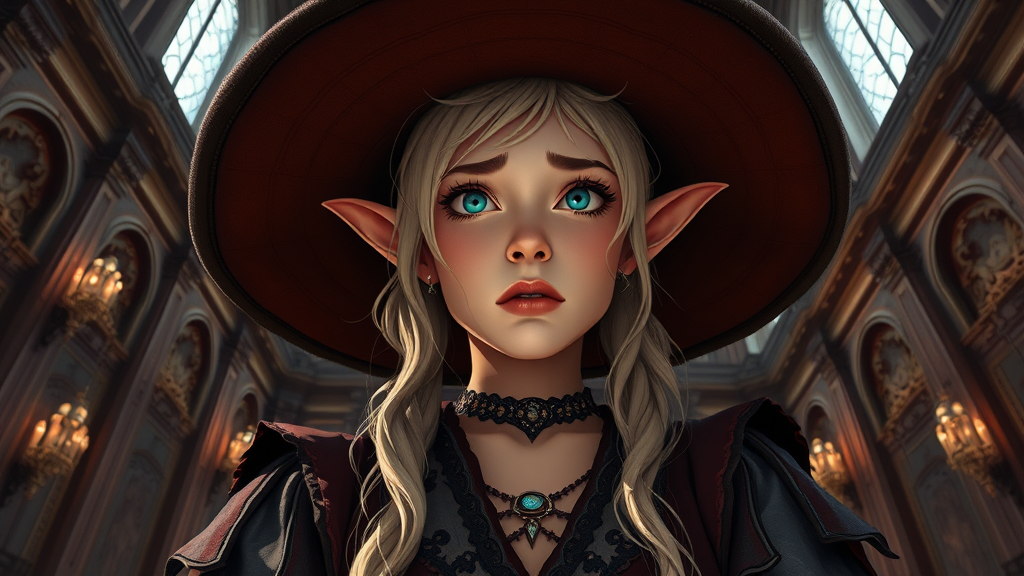 Professional portrait of a female elf wizard in a grand palace, capturing a close-up with a disappointed expression. She wears an oversized hat and long, tattered robes that exude a seductive aura. The perspective is from below, rendered in a cartoon style with a fantasy Victorian aesthetic. The scene features complex, ultra-detailed lighting, maintaining a coherent and visually pleasing composition. The setting is richly detailed and imaginative, blending elements of fantasy and realism seamlessly.