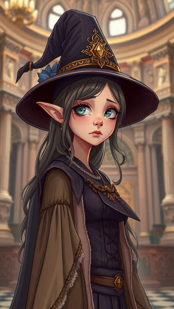 Professional Portrait of a female elf wizard in a grand palace, featuring a close-up view with a disappointed expression. She wears a large ornate hat and long, tattered yet elegant clothes, exuding a subtly seductive presence. The composition is from a slightly lower angle, rendered in a cartoon style with a fantasy Victorian aesthetic. The scene is intricately detailed with complex lighting, achieving an ultra-detailed look. The atmosphere is coherent and surreal, capturing the essence of an Unrealistic Dream, avoiding any unrealistic or negative elements.
