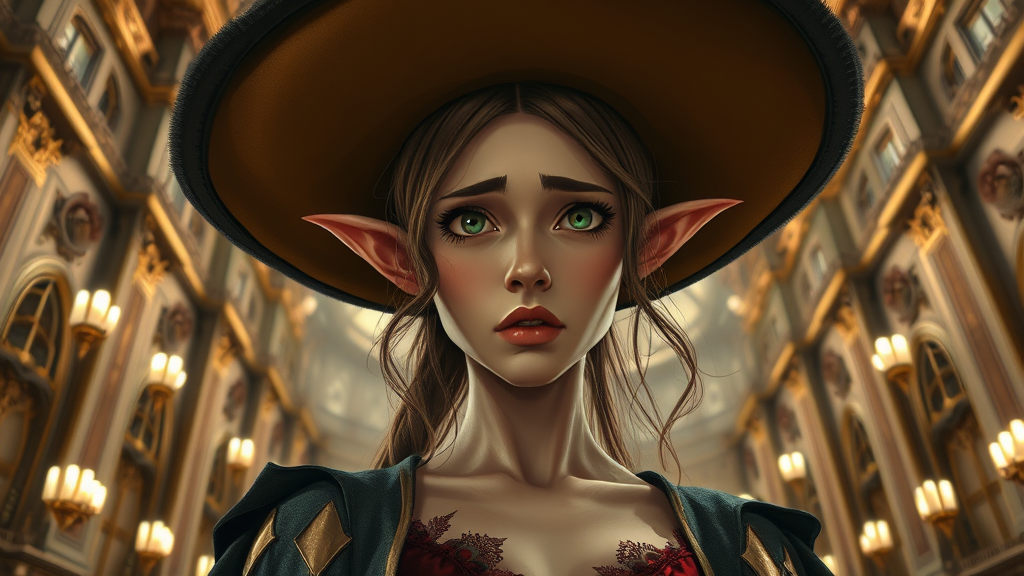 Professional Portrait of a female elf wizard in a grand palace, featuring a close-up of her disappointed expression. She wears a large, elaborate hat and long, torn garments that carry a seductive edge. The perspective captures her from below, embodying a cartoonish fantasy Victorian aesthetic with complex lighting that adds depth and intensity. The scene is ultra-detailed with an absurd yet coherent resolution, balancing elements of realism with dream-like qualities that enhance the ethereal atmosphere.