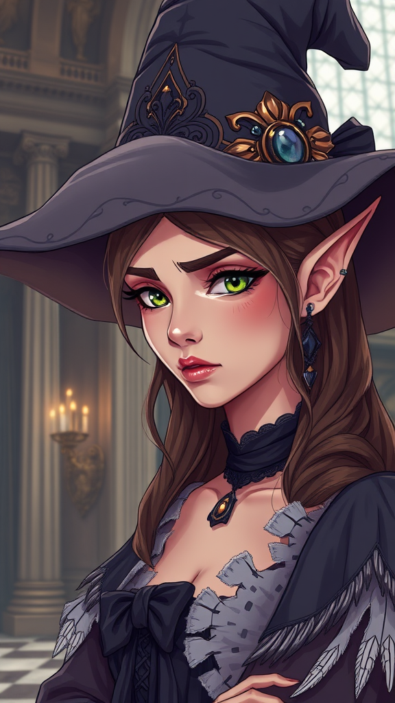 Professional portrait of a female elf wizard in a grand palace setting; the focus is on a close-up with a disappointed expression, wearing an elaborate large hat and long, intricately torn Victorian-inspired attire. She exudes a seductive yet enigmatic aura, portrayed from a slightly low angle to enhance her mystical presence. The scene is rendered in a cartoonish style with a fantasy Victorian aesthetic, showcasing complex, dynamic lighting. The image is ultra-detailed, featuring high-resolution elements with coherent compositions, blending elements of fantasy with slight touches of surrealism to add depth and interest.