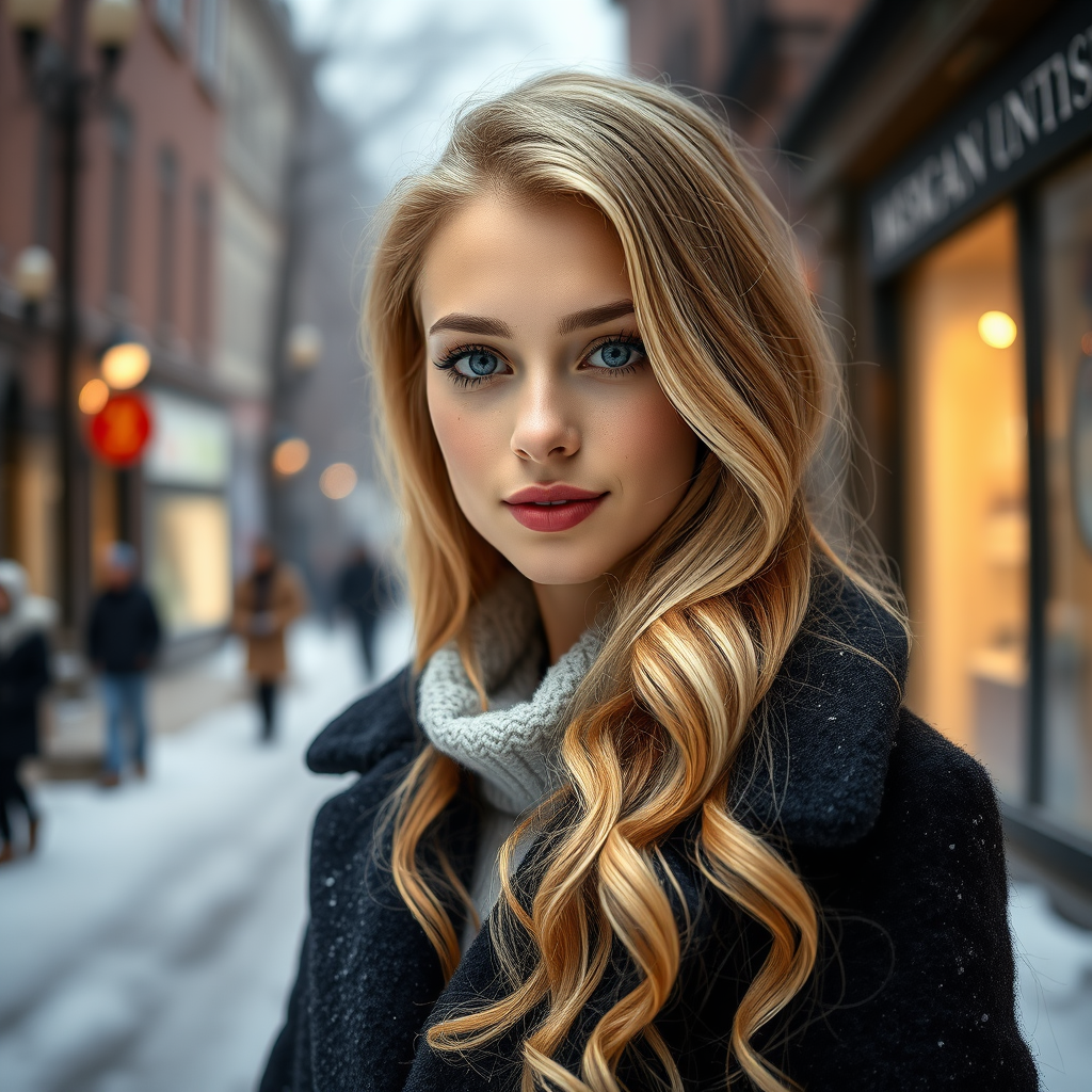 Professional portrait of a stunning Norwegian girl with long wavy blonde hair and delicate freckles, her face beautifully symmetrical, adorned with soft natural makeup. She's dressed in elegant winter attire, standing in a picturesque snowy urban street. The scene is set in a modern upscale environment, captured with ultra-realistic clarity and rich detail in a medium shot. The photograph employs sharp focus and depth of field at f/1.8 using an 85mm lens, with bright diffused lighting and gentle volumetric fog creating a serene atmosphere. It's a captivating image that blends high dynamic range details, embodying a sense of contemporary elegance and trending appeal.