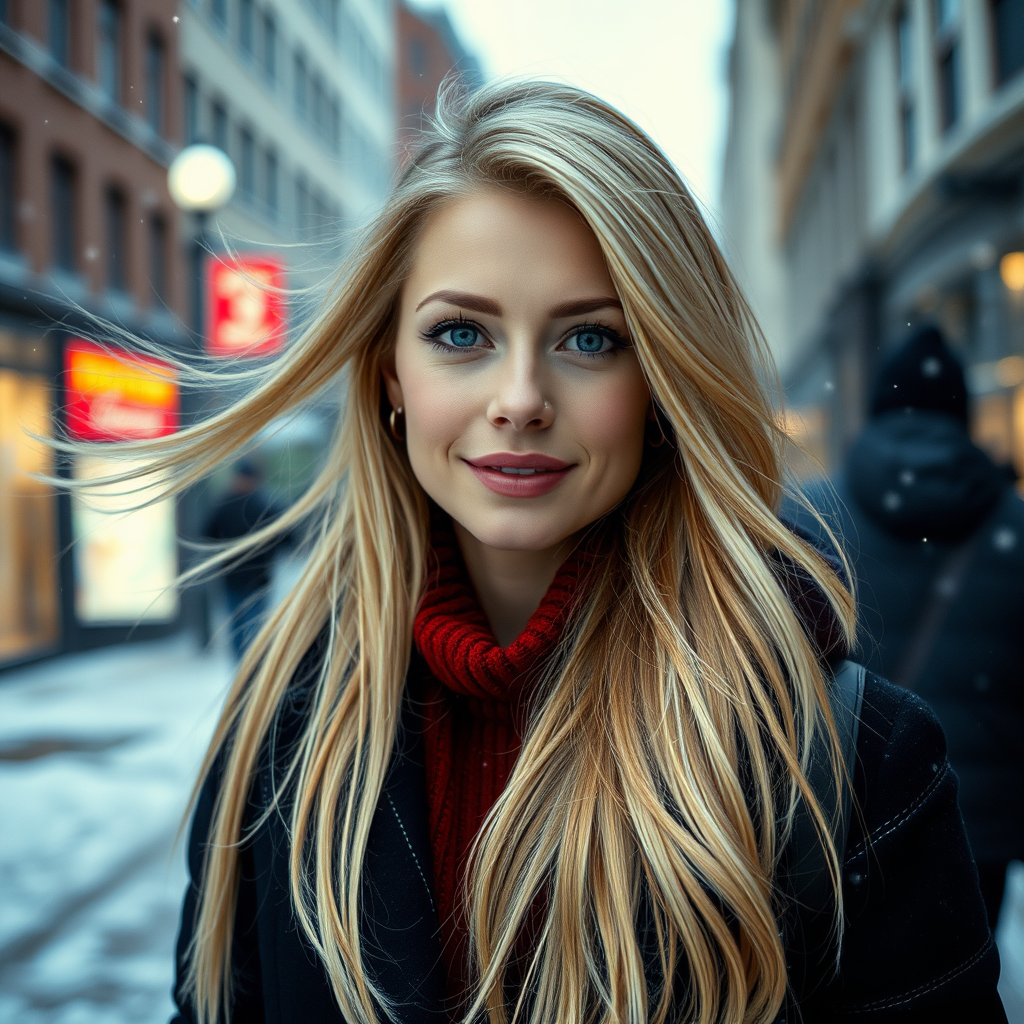 Professional portrait of a stunning Norwegian woman adorned in stylish winter attire; her long, flowing blonde hair catches the gentle breeze, while her flirty expression and delicate freckles accentuate her beautifully symmetrical face. Her makeup is minimal yet charming, enhancing her natural beauty. She is poised in a snowy city street, set against a backdrop of modern urban elegance. The image is captured with ultra-realistic precision, showcasing intricate details in sharp focus. The use of f/1.8 and an 85mm lens creates a pleasing depth of field in this medium, centered shot. The scene is enriched with professionally graded colors, bright, diffused lighting, and soft volumetric fog, giving it a contemporary feel trending on Instagram and Tumblr. The photograph, rendered in HDR 4k and 8k, is captured with an aspect ratio of 2:3.