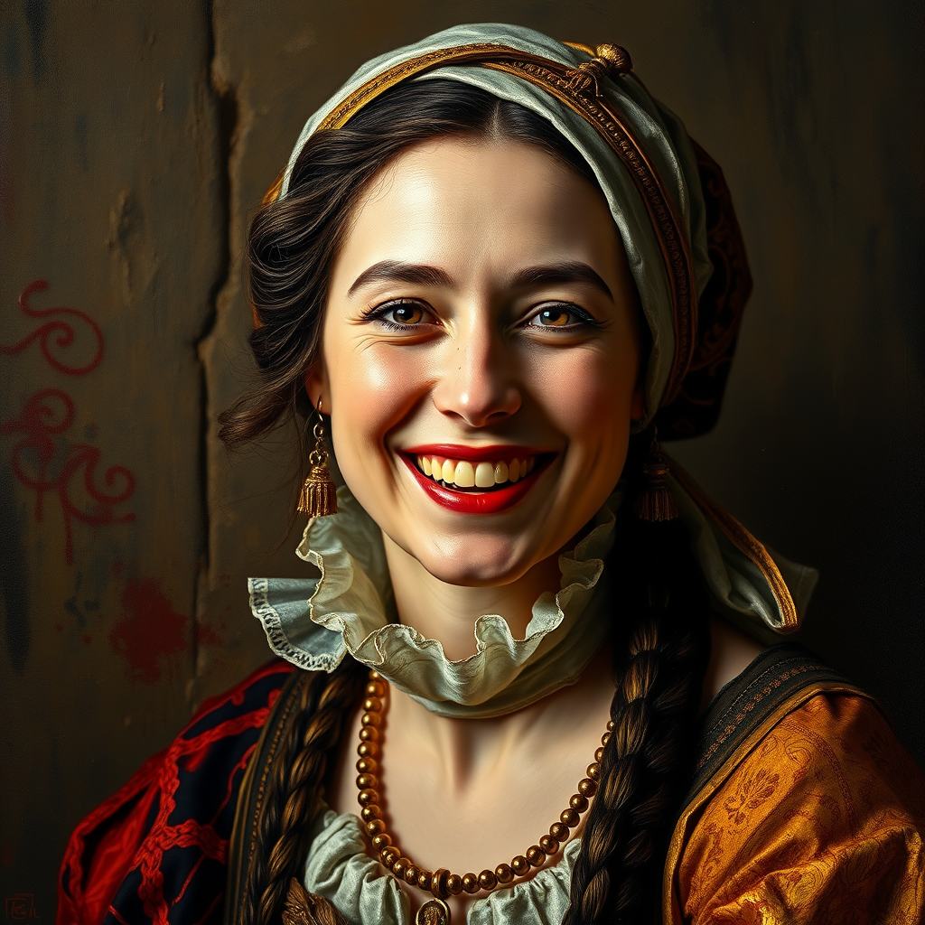 Professional portrait of a XII century woman with a joyful expression, styled in the fashion of the time. The painting features bold, heavy brushstrokes and a rich texture created with impasto techniques, highlighting the intricate details of her attire and surroundings. Her skin is highly textured, capturing the depth and realism of her features. The scene is bathed in cinematic lighting, creating a dramatic atmosphere that brings out the vividness of oil paint. The artwork, imagined as a collaborative masterpiece by Vittorio Matteo Corcos, Albert Lynch, and Tom Roberts, exudes an 8k-resolution finish, making it a trending piece on ArtStation with its timeless elegance and historical allure.