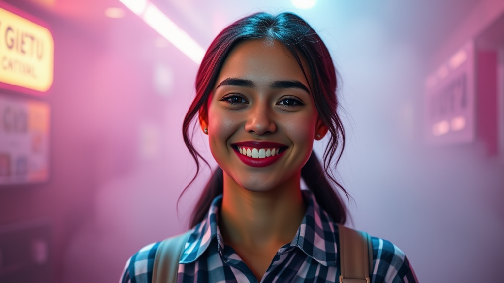 Professional portrait of Anya Taylor-Joy smiling, adorned in a stylish preppy schoolgirl outfit, radiant olive complexion, flawless features; set against a backdrop of vibrant neon light haze, enveloped in soft volumetric fog. Hyperrealistic depiction with subtle indirect lighting, meticulously detailed and awe-inspiring, 8k ultra-high-definition quality.