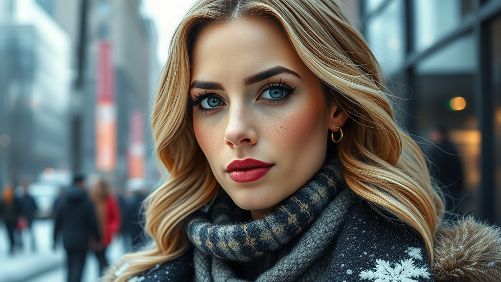 Professional portrait of Gal Gadot in stylish winter attire with cascading wavy blonde hair, delicately dusted with freckles, exhibiting a beautifully symmetrical face and subtle, natural makeup. Set against a stunning modern urban upscale backdrop, the scene is rendered in ultra-realistic detail, embracing the elegance and intricacy of concept art. The image is captured with sharp focus, employing a depth of field at f/1.8 using an 85mm lens, delivering a visually striking medium shot. The ambiance is enriched with soft volumetric fog, offering a cinematic feel. The composition is intended to be visually captivating, suitable for trends on Instagram and Tumblr, presented in HDR 8K for a realistic cinematic experience. Unique creative elements enhance the core concept, ensuring the portrayal remains both captivating and true to its essence.