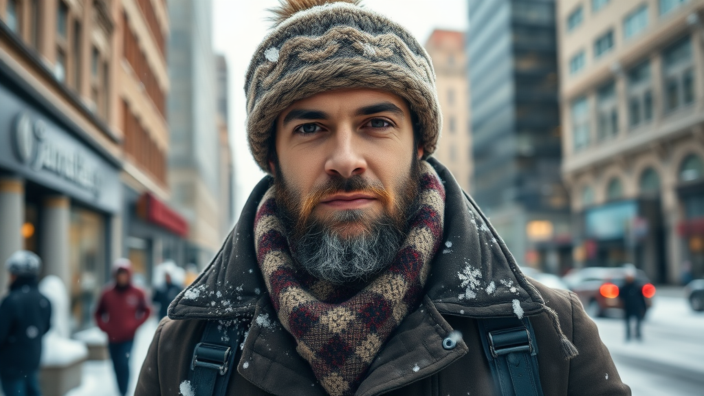 Professional portrait photograph of a ruggedly handsome Norwegian man in luxurious winter attire, posed in a picturesque snowy urban cityscape, captured in a highly realistic style with an emphasis on modern architectural elegance, showcasing intricate and detailed elements. The image features a sharp focus, enhanced depth of field, with an f/1.8 aperture and 85mm lens, taken in a medium shot. The composition is bathed in bright yet soft diffused lighting, enveloped in gentle volumetric mist, with an aesthetic appeal that resonates on platforms like Instagram and Tumblr. Presented in vibrant HDR 4k, 8k resolution, the scene retains a touch of artistic flair by incorporating subtle creative enhancements while preserving the essence of the original inspiration.