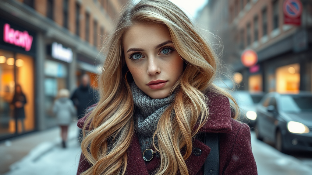 Professional portrait photograph of a stunning Norwegian girl in chic winter attire, her long, wavy blonde hair cascading elegantly, eyes glinting mischievously, with delicate freckles and perfectly balanced features enhanced by subtle, natural makeup. She stands poised in a snowy city street, exuding elegance in a vibrant modern urban setting, captured in ultra-realistic detail with concept art influences. The image is intricate and sharply focused, employing depth of field with an f/1.8 aperture and shot with an 85mm lens, presenting a medium shot with impeccable centered composition. The scene is professionally color graded with bright, diffused light and enveloped in delicate volumetric fog, making it a visual sensation on social media platforms like Instagram and Tumblr, stored in hdr 4k and 8k resolution, with small creative embellishments added while maintaining core elements.
