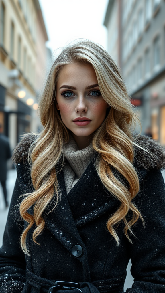 Professional portrait photograph of a stunning Norwegian girl in luxurious winter attire, with long wavy blonde hair and freckles, showcasing a beautifully symmetrical face and subtle, natural makeup. She stands confidently in a snowy urban street, surrounded by an elegant and modern environment. The image is ultra-realistic and conceptually sophisticated, with intricate details captured in sharp focus. The depth of field is carefully managed at f/1.8 with an 85mm lens in a medium shot. The scene is illuminated by bright, soft diffused light that creates an ethereal atmosphere, enhanced by a gentle volumetric fog. The composition trends on social media for its HDR quality in both 4k and 8k resolution, offering a captivating visual experience.