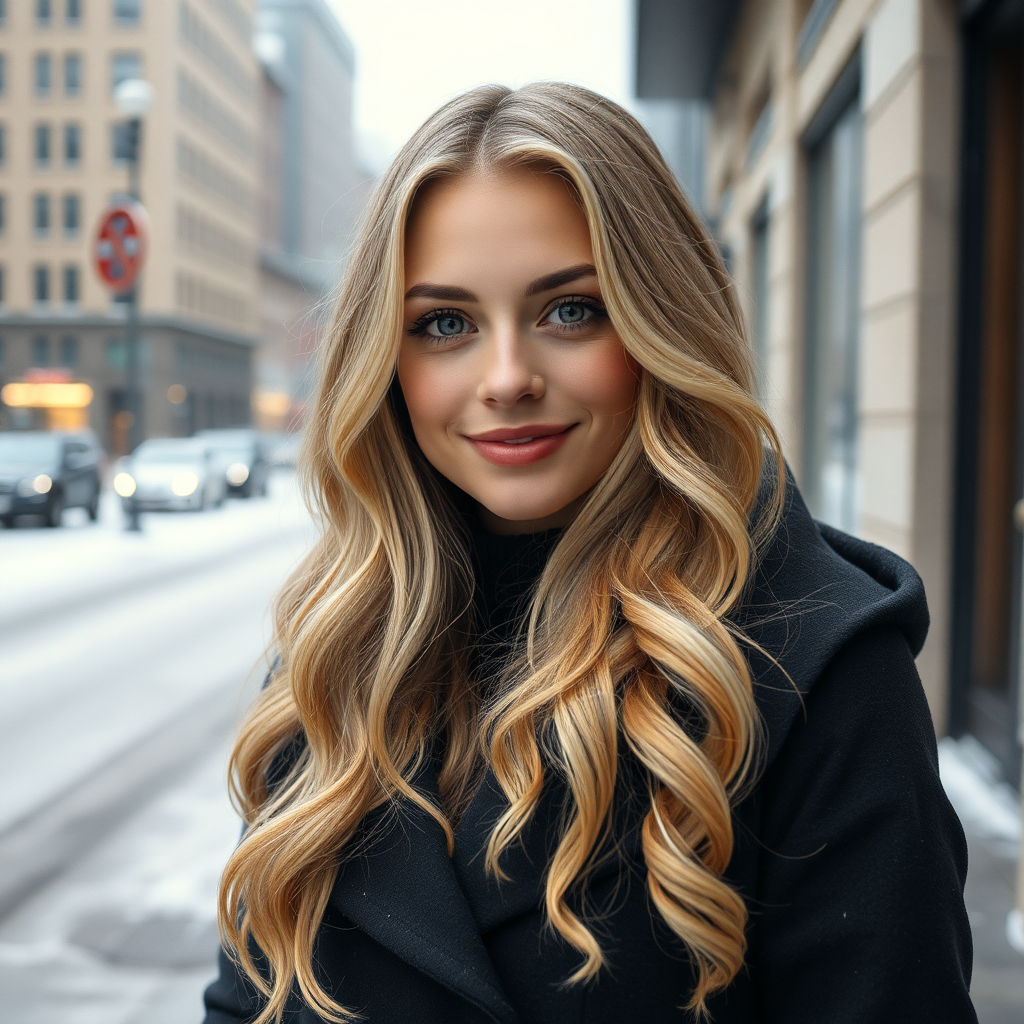 Professional portrait photograph of a stunning Norwegian woman in winter attire, featuring long wavy blonde hair and a playful expression. She has a symmetrical face with delicate freckles and subtle natural makeup. She stands outdoors on a snowy city street within a modern upscale urban environment. The image is ultra-realistic with elegant, highly detailed intricacies and sharp focus. The depth of field is set at f/1.8 with an 85mm lens, capturing a medium shot that is perfectly centered. The photo is professionally color graded with bright, softly diffused lighting and enveloped in a gentle volumetric fog. The portrait has a high-definition quality, making it suitable for trending on social media platforms like Instagram and Tumblr.