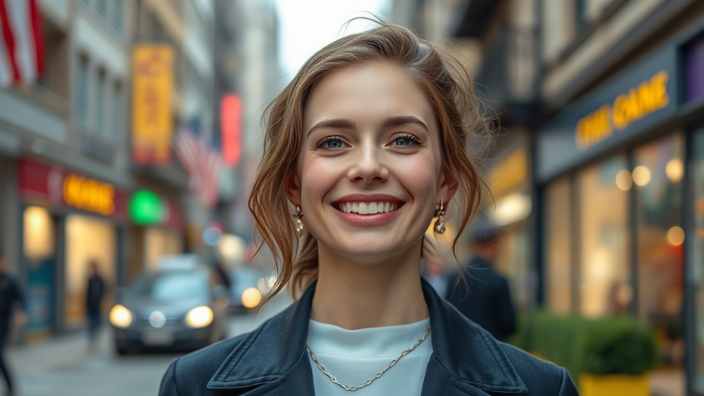 Professional portrait photograph of Anya Taylor-Joy smiling on a vibrant city street, ultra-realistic, concept art, elegant, highly detailed, intricate, sharp focus, depth of field, f/1.8, 85mm, medium shot, mid shot, vivid colors, captivating, modern, chic, natural hair, enchanting atmosphere, single subject, perfect framing, radiant beauty, youthful, fashionable, healthy, affluent, complete, dynamic pose, natural lighting, trending on Instagram, trending on Tumblr, 4k, 8k.