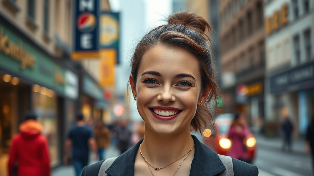 Professional portrait photograph of Anya Taylor-Joy smiling warmly on a bustling city street, hyper-realistic, concept art, sophisticated and intricately detailed, sharp focus, beautiful depth of field with f/1.8 aperture, 85mm lens, medium framing, vibrant and colorful, capturing the essence of trending imagery on Instagram and Tumblr, high-resolution clarity in 4k and 8k, maintaining focus on elegance and charm, avoiding any distractions or imperfections.
