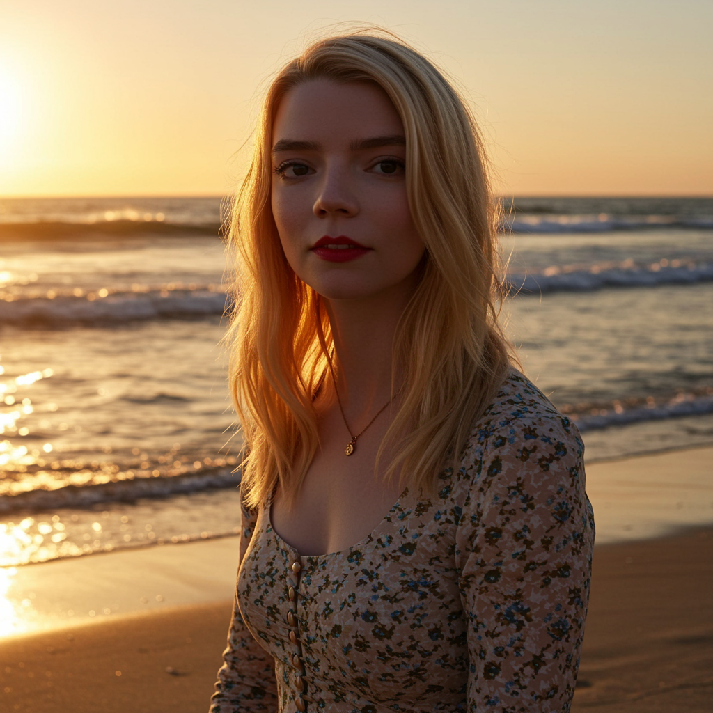 Professional portrait photograph of Anya Taylor-Joy on the beach, ultra-realistic, concept art, elegant, highly detailed, intricate, sharp focus, depth of field, f/1.8, 85mm, medium shot, showcasing her effortless grace and beauty. The scene captures the warmth of the sunset, casting a golden glow, with soft waves in the background. Anya's natural hair flows gently in the breeze, her attire reflecting a blend of classic and modern elegance. The ambiance is serene, and the composition highlights her captivating gaze, embodying a sense of timeless allure. This stunning image is trending on Instagram and Tumblr, presented in vibrant, high-resolution 4k and 8k quality.