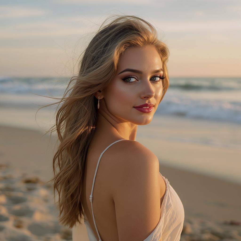 Professional portrait photograph of Anya Taylor-Joy on the beach, ultra-realistic, concept art, elegant, highly detailed, intricate, sharp focus, depth of field, using 85mm lens at f/1.8, featuring a medium shot that captures her natural beauty and elegance. The composition highlights the serene beach backdrop with gentle waves in the distance and soft golden lighting. Her relaxed posture and graceful expression exude sophistication, with the setting sun casting a warm glow. The image is perfect for trending on Instagram and Tumblr, presented in stunning 8k resolution, capturing every detail with crystal clarity. The scene is thoughtfully composed, showcasing her unique charm in a vivid and captivating manner.