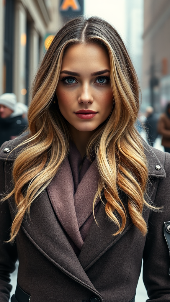 Professional portrait photograph of Gal Gadot in winter clothing with long wavy blonde hair, featuring freckles and a beautifully symmetrical face, with cute natural makeup, set in a stunning modern urban upscale environment. The image is ultra-realistic, resembling concept art with an elegant, highly detailed, intricate and sharp focus. It has depth of field captured with f/1.8 at 85mm, and is in a medium shot format. The scene includes soft volumetric fog, giving it a cinematic feel that is trending on Instagram and Tumblr. The image is in HDR 4k, offering a realistic and visually appealing view.