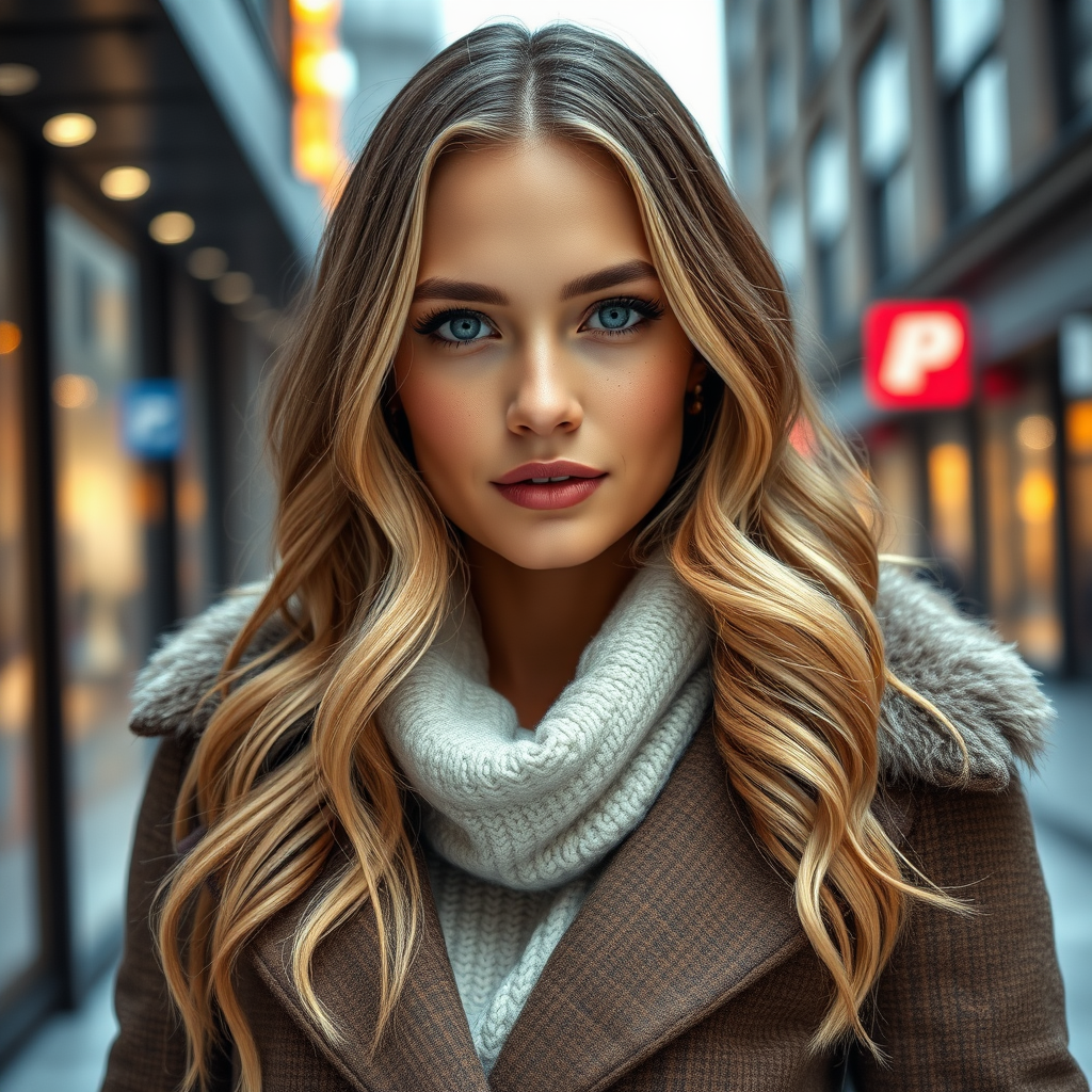 Professional portrait photograph of Gal Gadot wearing stylish winter clothing featuring long, wavy blonde hair and subtle freckles. Her beautiful symmetrical face is accented with cute natural makeup. The scene is set in a stunning modern urban upscale environment, capturing an ultra-realistic essence with concept art elements. The portrait is elegant, highly detailed, and intricately captures sharp focus with depth of field using an f/1.8 aperture and 85mm lens in a medium shot. The atmosphere is enhanced with volumetric fog, giving it a trending vibe worthy of Instagram and Tumblr. The image is in vibrant HDR 4k, presenting a realistic and cinematic feel.