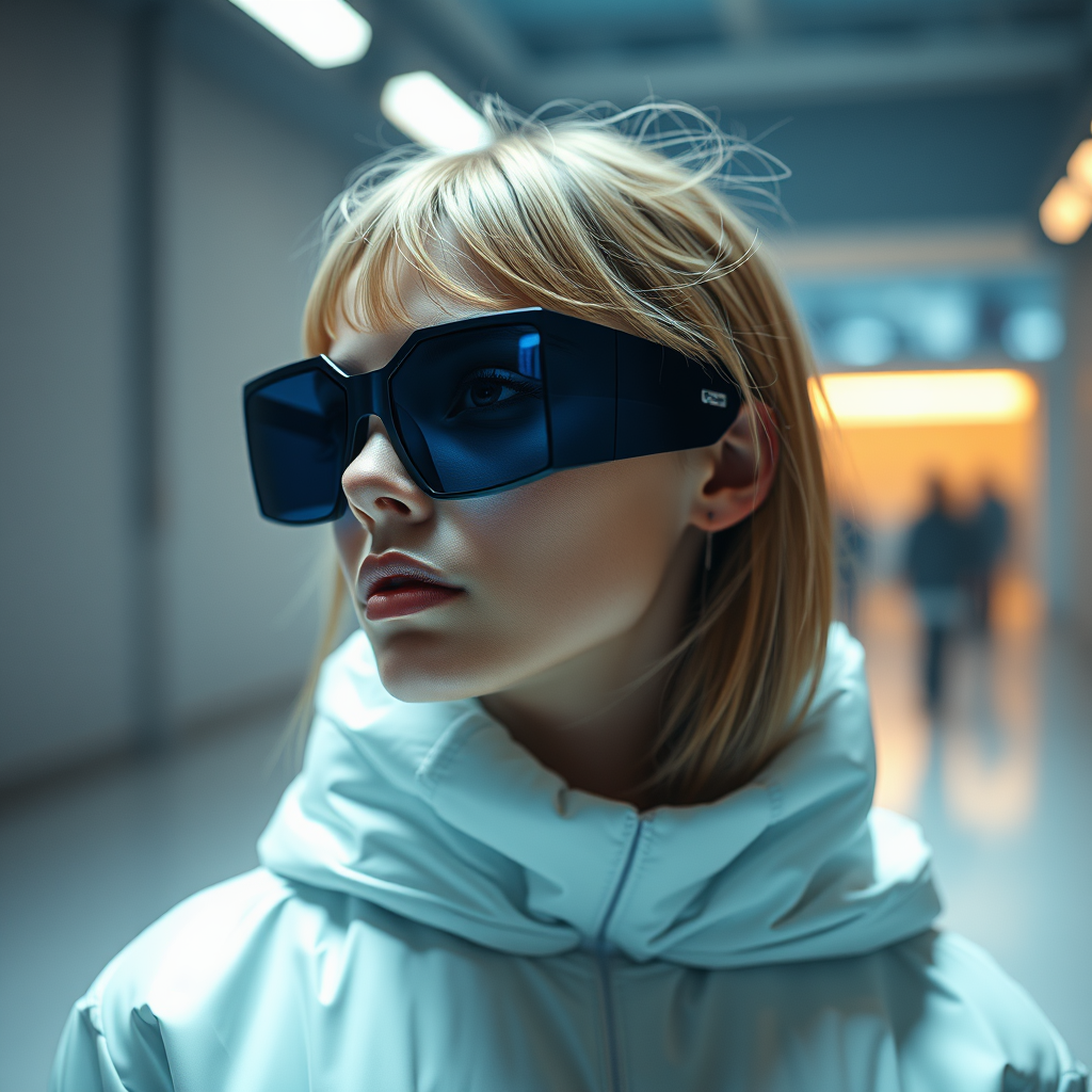 Professional studio advertising featuring a futuristic girl in a full-body fashion shoot, inspired by a Jacquemus and Moncler collaboration. She sports sleek dark blue translucent futuristic sunglasses. The image is hyper-realistic, with incredible 8k detail. The atmosphere blends realism with a slight touch of surreal chaos, evoking a sense of avant-garde fashion, as the camera pans left to capture her in an elongated 74:63 frame ratio.