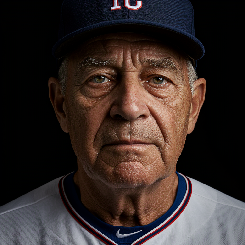 Professional studio portrait, weathered and weary visage of an elderly baseball player, pristine studio lighting, 8k ultra-realistic rendering, extremely high-resolution detail, intricately captured features, positioned against a solid black background, premium stock photograph quality, expert color enhancement to emphasize textures --ar 9:16 --v 4.