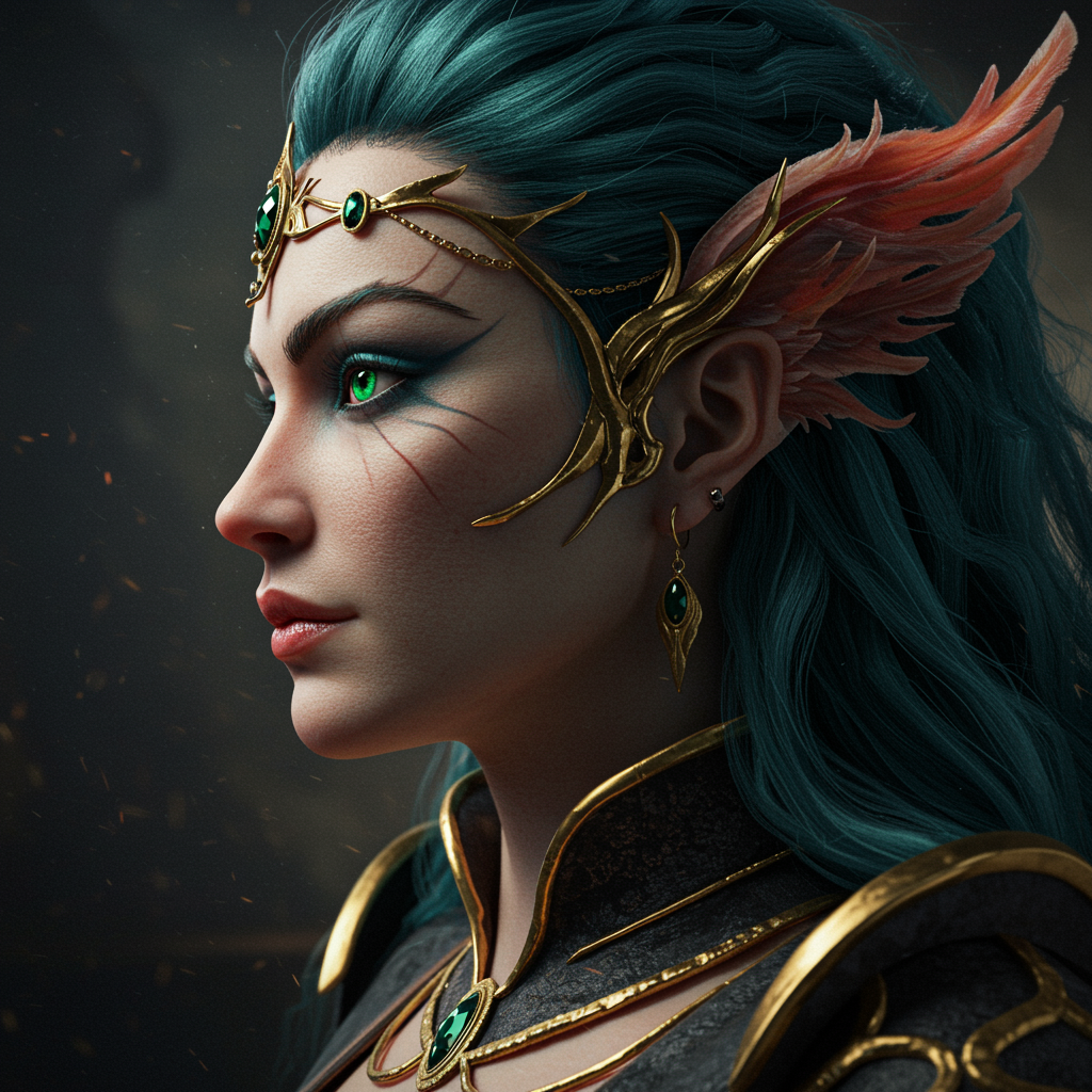 View this AI-generated image featuring a side profile of an intricately detailed game character depicting an eternal goddess with vivid emerald green eyes highly detailed and set in a subtly dim ambiance the overall appearance is ultra realistic showcasing hyper detailed features akin to a photograp