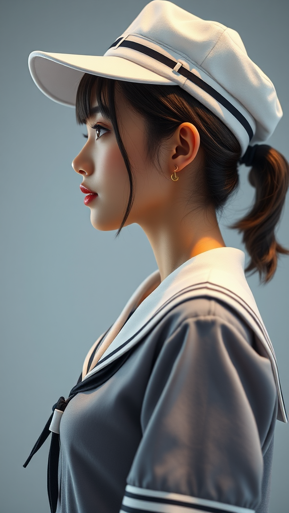 Profile shot of a charming Japanese college student, dressed in a pristine school uniform, complemented by a stylish sailor cap, showcasing her natural beauty with no makeup. The image captures her elegance with intricate details and photometric lighting, focusing on symmetric illumination. The photograph is rendered in ultra high-resolution, emphasizing the fine quality and detail.
