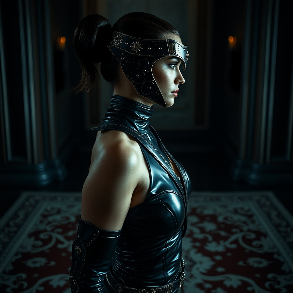 Profile view of a stunningly detailed, elegant warrior woman with luminous, captivating eyes, dressed in a form-fitting latex ensemble. She stands poised on a luxurious carpet crafted from leather and silver, showcasing her entire stunning form. The scene is captured in a dimly lit, ultra-realistic, hyper-detailed photograph reminiscent of Irving Penn and Annie Leibovitz's photography style. The image evokes a sense of vivid realism as if retouched by the skilled hand of Pratik Naik, using a Leica SL2 camera with a f/5.6 aperture and a 105mm lens.