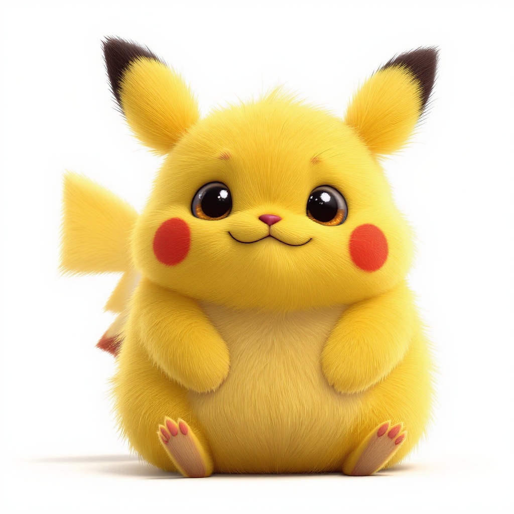 Promotional art featuring an exceptionally adorable Pikachu character with a Disney Pixar twist. The Pikachu is round, fluffy, and very furry, capturing the essence of a 1990s iconic film character. It combines elements of the classic Pikachu and Detective Pikachu, with detailed, realistic fur. The artwork is a 3D render, inspired by concept art from renowned artists like Artgerm, Ilya Kuvshinov, Katsuhiro Villeneuve, Jeremy Lipkin, Michael Garmash, and Rob Rey, with a touch of Disney Pixar's Zootopia style. The background is white, emphasizing Pikachu's vibrant features and charming expression.