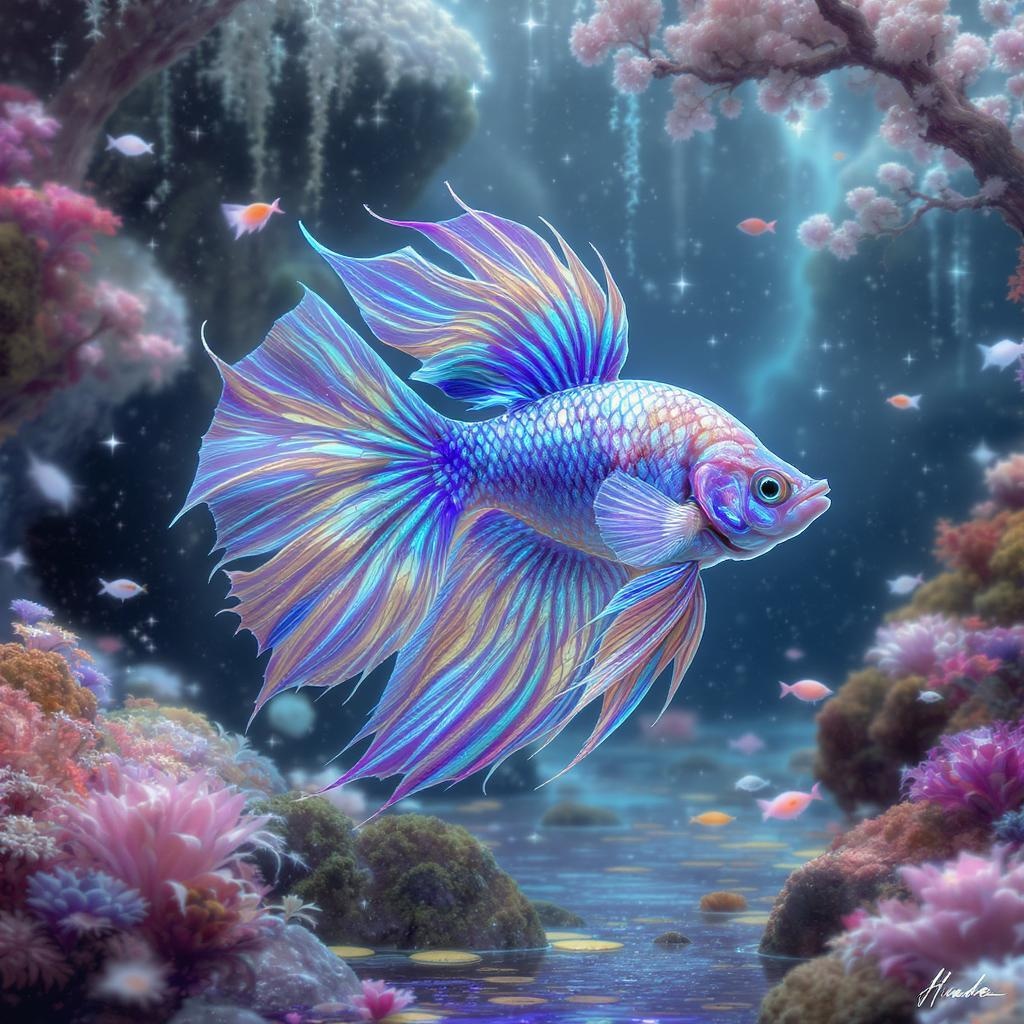 Prompt: "A fantastical betta fish featuring magical and vivid patterns on its flowing fins, shimmering with iridescent fairy-like hues. Set in an underwater river scene adorned with psychedelic aquatic flora, radiant colors, and a dreamlike ambiance. Ultra-detailed fantasy art with gentle lighting, capturing a surreal and enchanting world."