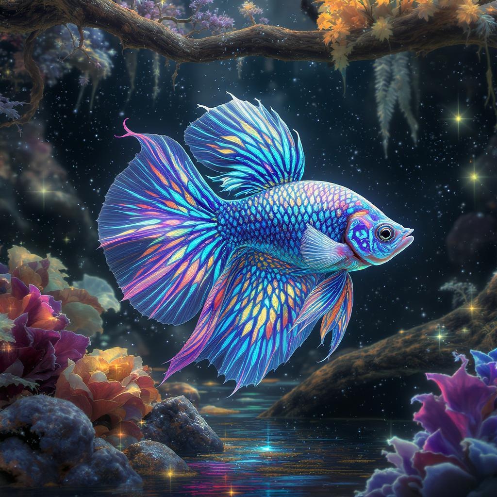 Prompt: "A mystical betta fish adorned with enchanting, kaleidoscopic patterns on its fins, shimmering in luminous, ethereal hues. Set in an underwater realm of a stream, surrounded by fantastical aquatic flora, vivid and otherworldly colors, a dreamlike scene, intricately detailed, fantasy illustration, gentle illumination." Negative prompt: "blurry, low quality, dark, monochrome, realistic style, disfigured, extra limbs, text elements, watermark presence, cluttered background, dull colors, low contrast, distorted features."