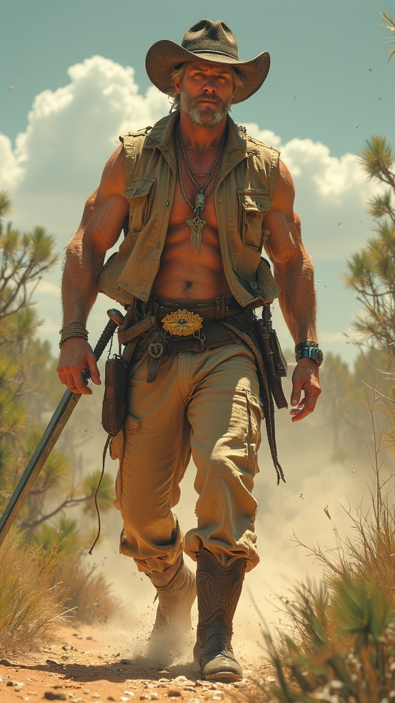 Protector of the Outback, Australian hunter, hypermasculine male. Tall, athletic, strong, muscular, sinewy, well defined manly man. Caucasian male with clear Teal eyes, strong brow and squared jaw, blonde goatee on his face, usually a surly smile. Medium length sandy-blonde hair that he wears combed back, usually underneath a Crocodile Dundee type of hat. The hat is an Outback Sidewinder, dark tan with crocodile teeth around the band. He also wears a sleeveless tan camouflage fatigue jacket, unbuttoned and exposing his chest. His chest and abs are well defined. Gold chain with spear shaped pendant and bolo tie around his neck. Tan khaki cargo pants cover his strong, powerful legs and obvious crotch bulge. Dark brown alligator cowboy boots on his feet. He carries a machete when travelling through the Outback. Full body pose. Travelling through the Outback. Tan khaki cargo pants. [[masterpiece]]
