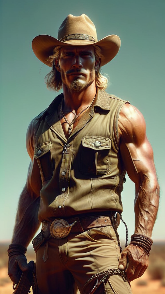 Protector of the Outback, Australian hunter, hypermasculine male. Tall, athletic, strong, muscular, sinewy, well defined manly man. Caucasian male with clear Teal eyes, strong brow and squared jaw, blonde goatee on his face, usually a surly smile. Medium length sandy-blonde hair that he wears combed back, usually underneath a Crocodile Dundee type of hat. The hat is an Outback Sidewinder, dark tan with crocodile teeth around the band. He also wears a sleeveless tan camouflage fatigue jacket, unbuttoned and exposing his chest. His chest and abs are well defined. Gold chain with spear shaped pendant and bolo tie around his neck. Tan khaki cargo pants cover his strong, powerful legs and obvious crotch bulge. Dark brown alligator cowboy boots on his feet. He carries a machete when travelling through the Outback. Full body pose. Travelling through the Outback. Tan khaki cargo pants. [[masterpiece]]