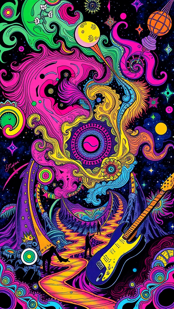 Psychedelic 1970s rock band album cover art featuring swirling patterns of vibrant colors, intricate vintage designs with bold neon hues, abstract shapes and kaleidoscopic imagery that evoke the essence of an era, set against a cosmic backdrop with retro typography and an adventurous, surreal vibe.