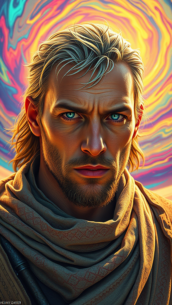 Psychedelic Dune portrait, a vivid depiction of a rugged male Dune character featuring iconic blue eyes and sun-hardened skin, exuding a quiet yet stern determination. His tattered desert attire appears to dance with the unseen desert zephyrs. The backdrop bursts with dazzling, psychedelic hues, swirling like a dreamlike, extraterrestrial sky. Intricate details like the patterns on his clothing, glistening sand granules upon his skin, and subtle reflections within his eyes amplify the image's impact. The scene emits a surreal, ethereal ambiance, resonating with the enigmatic essence of the Dune universe. A palpable aura of subdued power and tension echoes the character's battles and triumphs. Drawing inspiration from Conrad Roset, Greg Rutkowski, and Makoto Shinkai, it merges Roset's lively colors and flowing aesthetics, Rutkowski's masterful lighting and detail, and Shinkai's majestic sense of scale and emotion. This artwork encapsulates the Dune figure in a distinctively captivating and surreal style, introducing some imaginative twists while maintaining the essence of the original narrative.