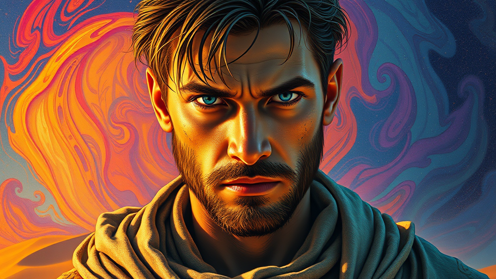 Psychedelic Dune portrait featuring a central figure, a rugged male character with penetrating blue eyes and skin touched by the harsh desert. His face shows a hint of stern determination, clad in worn desert attire that appears to ripple in the imaginary desert wind. The backdrop is a vivid, surreal tapestry of psychedelic hues swirling like an otherworldly sky. Intricate details like patterns on his garments, shimmering sand on his skin, and reflections in his eyes amplify the impact. The atmosphere is ethereal and surreal, aligning with the enigmatic spirit of the Dune universe. The air exudes quiet strength and tension, symbolizing the character’s inner battles and triumphs. Inspired by Conrad Roset’s vibrant colors and flowing lines, Greg Rutkowski’s masterful lighting and detailed textures, and Makoto Shinkai’s sense of scale and drama, this painting encapsulates the essence of the Dune character in a beautifully surreal style with a unique twist.